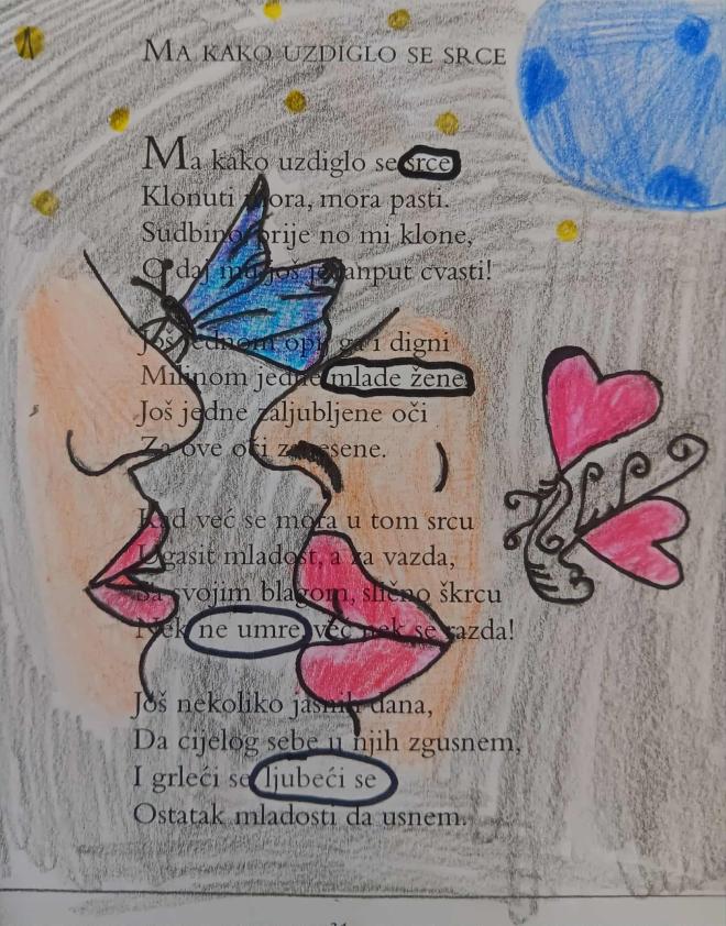 Učenici 7. i 8. razreda na satu Hrvatskoga jezika provodili kreativnu aktivnost uz pjesme Dobriše Cesarića. Učenici su radili ovu aktivnost uz eTwinning projekt “Lektiru u ruke, čitajmo bez muke 3”. Nakon zajedničkog čitanja i razgovora o pjesmama, izradili su vlastite primjere blackout poezije. Učenici su dobili ispisane pjesnikove tekstove te su, birajući ključne riječi i fraze, stvarali sasvim nova pjesnička značenja i vizualne kompozicije. Svoju su gotovu blackout poeziju na kraju sata razmijenili i predstavili prijateljima u razredu. Aktivnost je kod učenika potaknula stvaralaštvo, maštovitost i dublje razumijevanje Cesarićevih stihova.