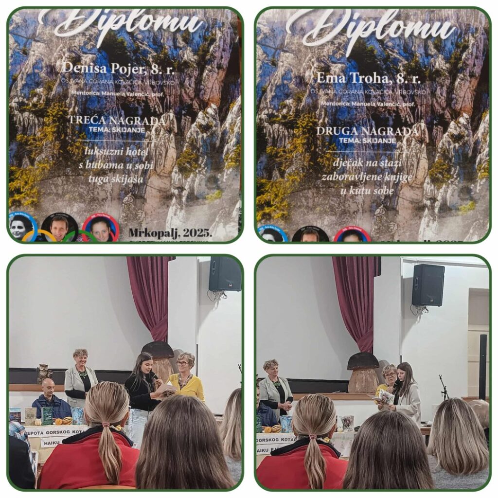 U subotu, 11. listopada 2025. u Domu kulture u Mrkoplju održana je promocija zbornika haiku radova “Malo po malo”. Učenice prošlogodišnjeg 8. razreda OŠ Vrbovsko Ema Troha i Denisa Pojer sudjelovale su na promociji. Ema je osvojila 2. nagradu, a Denisa treću. Teme haiku pjesama bile su skijanje, a mentorica je Manuela Valenčić.